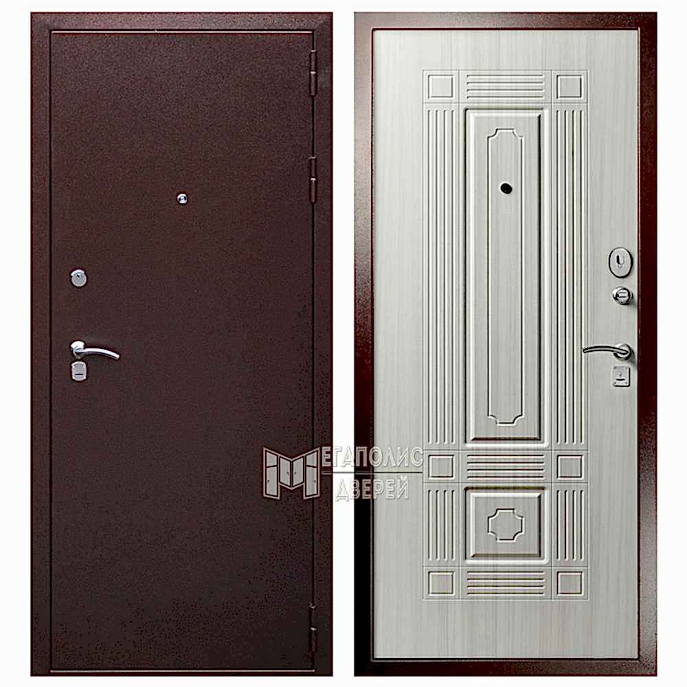 Дверь из высокопрочной стали, имеет два замка Гардиан 4 класса взломостойкости и ночную задвижку. Внешняя сторона двери окрашена в цвет «Антик-медь», с внутренней стороны Pin-Up в благородном цвете «Белый дуб». Оформление двери подойдет для классического интерьера.