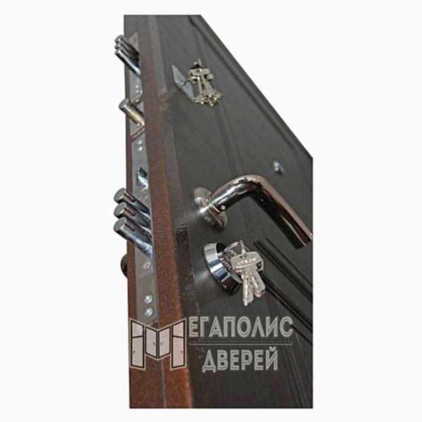 Кроме того, модель оснащена сувальдным и цилиндровым замками сверхнадёжной марки Pin-Up и дополнительной защёлкой «ночной сторож». Вероятность взлома также исключает наличие противосъёмных штырей.